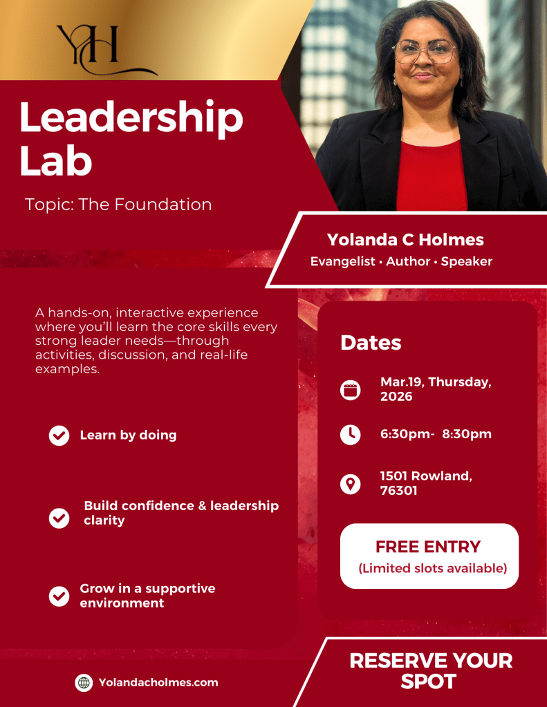 “Experience a Teaching Session with Yolanda—your choice of in-person or virtual attendance. This is more than a lecture; it is a free mentorship opportunity where you’ll enjoy deep-dive teaching and participate in hands-on Lab Work. Walk away with a leadership principle you can immediately apply to your life and calling.”